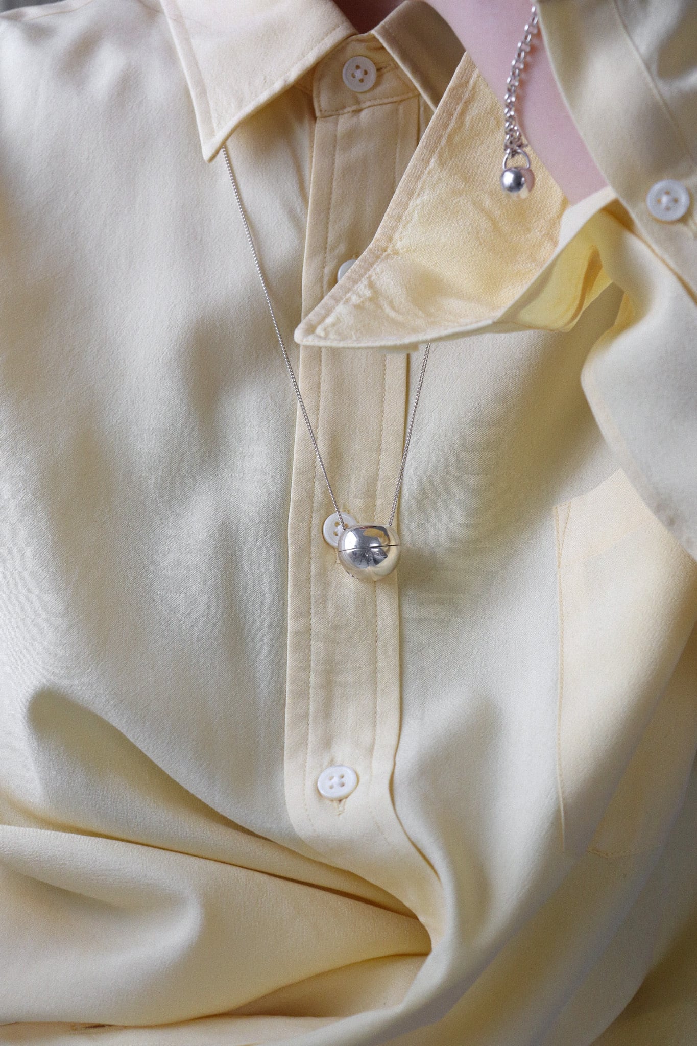 ヴィンテージの鈴から着想を得てオリジナルでデザインしたチェーンペンダント。存在感のある丸みのある鈴のトップはつけるとバスト下に落ち着き、チョーカーとの重ね付けもおすすめ。鈴は中空で開閉可能な仕様なので、お気に入りの香水を染み込ませたコットンボールや、旅先で拾った小石、愛猫の毛玉など、大切な思い出を忍ばせ身につけられたら。日常生活に邪魔にならない程度に揺らすと微かにコロコロとなります。ベビーギフトとしても喜ばれます。